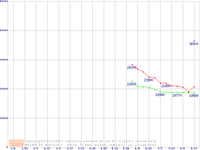 | [↑前グラフ]: | Deskstar 40GV (5,400rpm Ultra ATA/100)の最安値推移 |