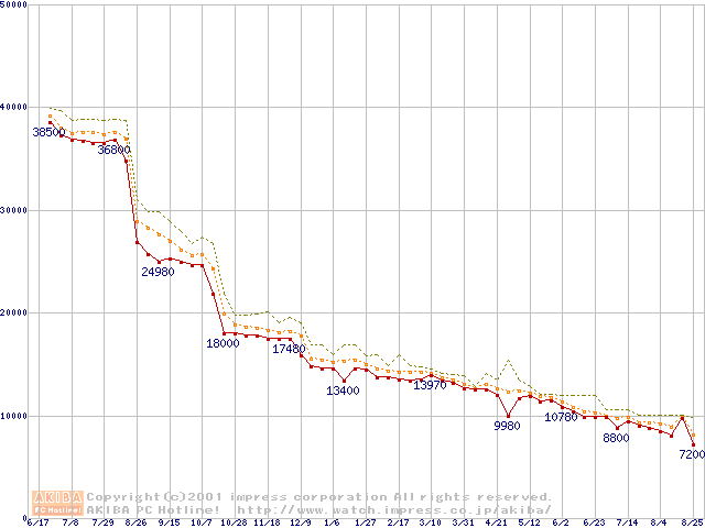 Socket A (Thunderbird,PGA,FSB 200MHz,L2 256KB)の最安値推移