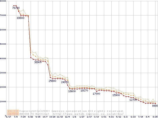 Socket A (Thunderbird,PGA,FSB 200MHz,L2 256KB)の最安値推移