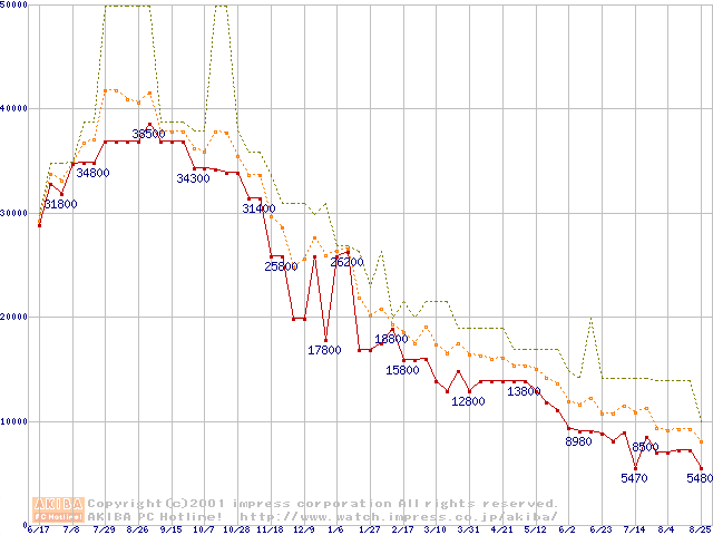 PC100 SDRAM DIMM CasLatency=2 ECC対応の最安値推移