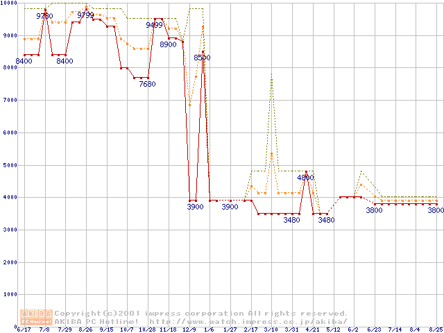 PC100 SDRAM DIMM CasLatency=2 ECC対応の最安値推移