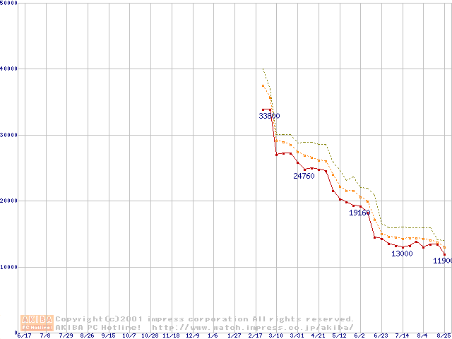 Socket A (Thunderbird,PGA,FSB 266MHz,L2 256KB)の最安値推移
