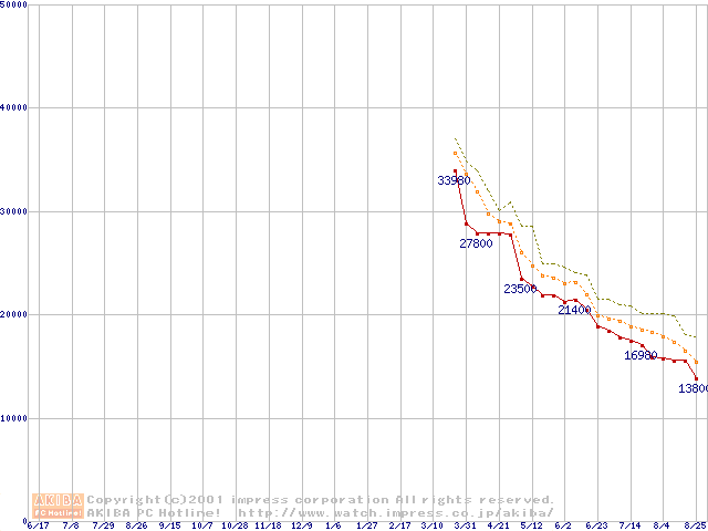 Socket A (Thunderbird,PGA,FSB 200MHz,L2 256KB)の最安値推移