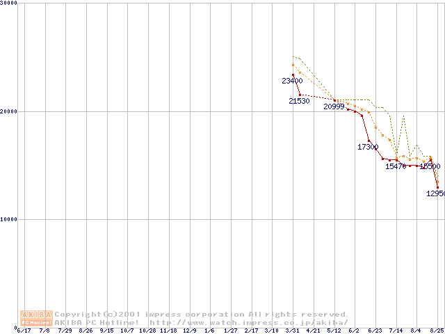 Socket A (Thunderbird,PGA,FSB 266MHz,L2 256KB)の最安値推移
