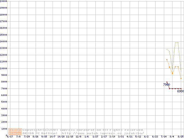 PC100 SDRAM DIMM CasLatency=2 ECC対応 Registeredタイプの最安値推移