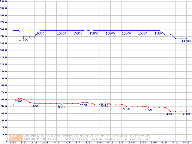 | [↑前グラフ]: | Socket A (PGA,FSB 200MHz,L2 64KB)の最安値推移 |