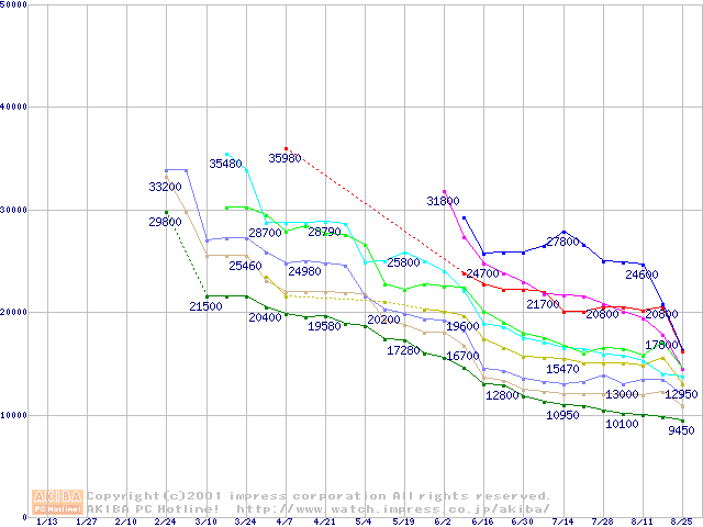 | [↑前グラフ]: | Socket A (Palomino,PGA,FSB 266MHz,L2 256KB)の最安値推移 |