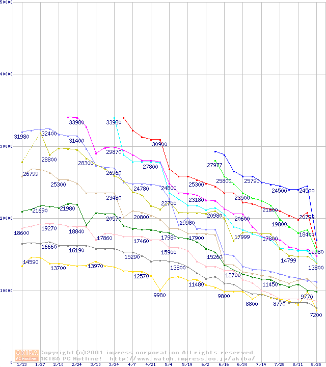 | [↑前グラフ]: | Socket A (Thunderbird,PGA,FSB 266MHz,L2 256KB)の最安値推移 |