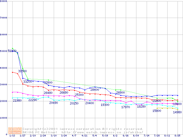 | [↑前グラフ]: | Socket 370 (FC-PGA2,FSB 133MHz,L2 256KB)の最安値推移 |