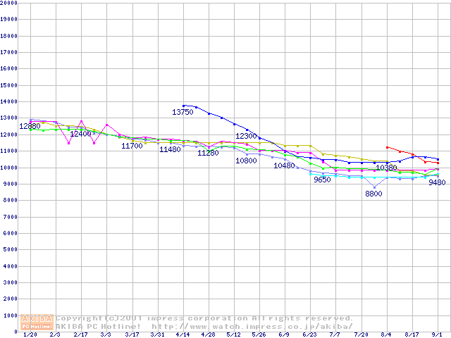 | [↑前グラフ]: | HDD 10GB~20GB未満(7,200rpmクラス)の最安値推移 |