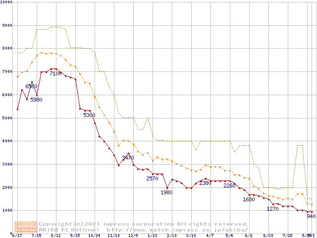 PC100 SDRAM DIMM CasLatency=2の最安値推移