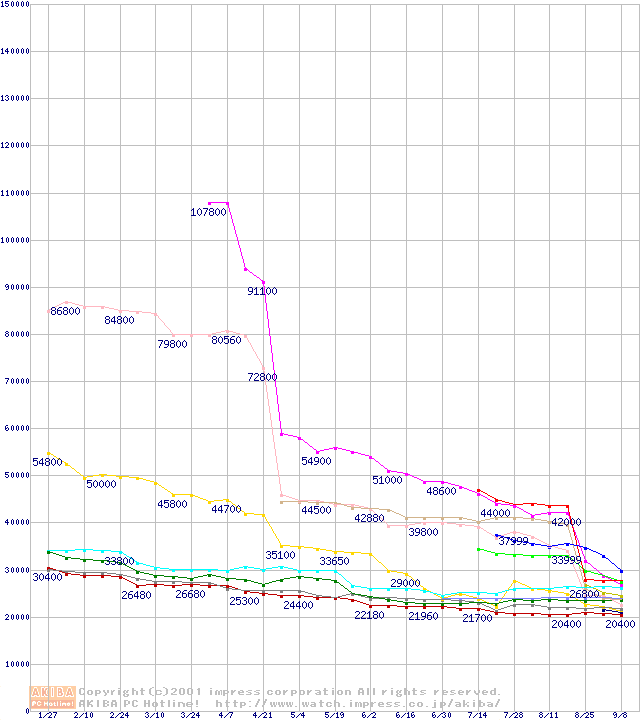 CPU主要製品(最安値1万円~2万円未満)の最安値推移