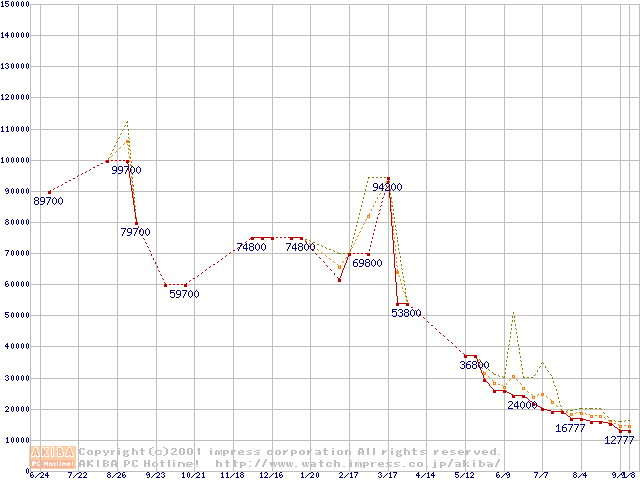 PC133 SDRAM DIMM CasLatency=3 ECC対応の最安値推移