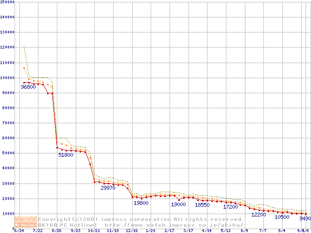 Socket A (Thunderbird,PGA,FSB 200MHz,L2 256KB)の最安値推移