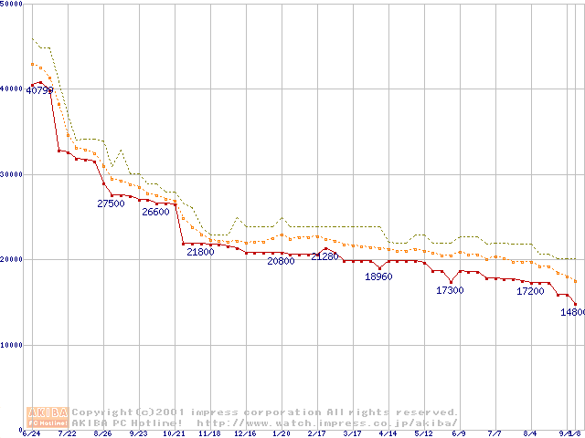 Pentium III 800EBMHz SECC2 リテールパッケージの価格推移