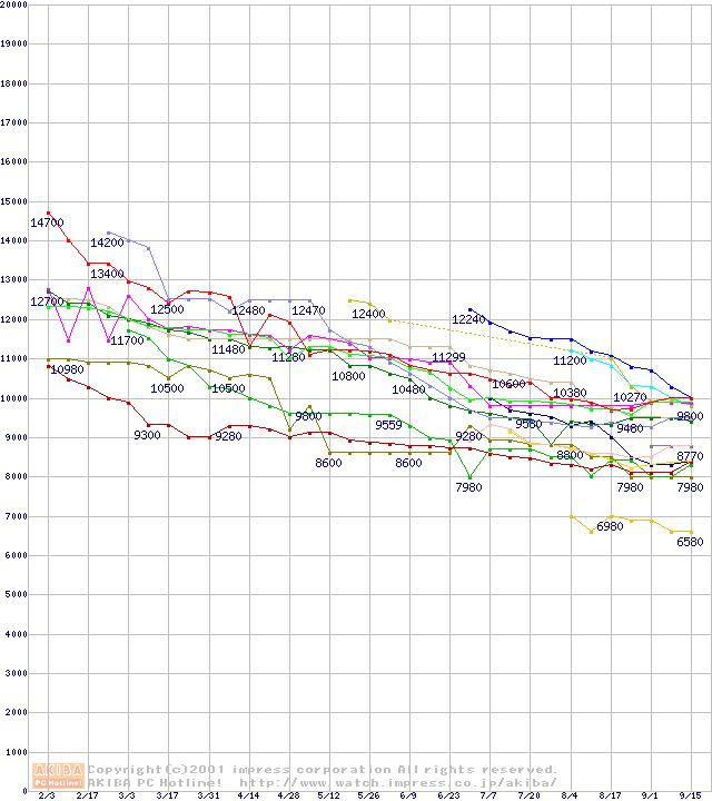 HDD主要製品(最安値1万円~1万5千円未満)の最安値推移