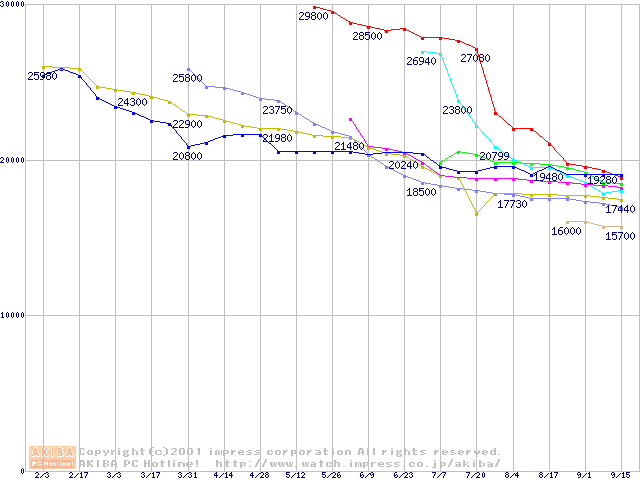 | [↓次グラフ]: | HDD主要製品(最安値2万円以上)の最安値推移 |