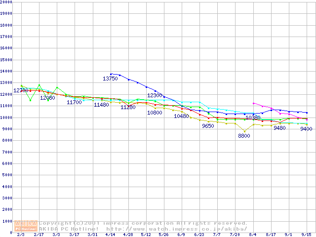 | [↑前グラフ]: | HDD 10GB~20GB未満(7,200rpmクラス)の最安値推移 |