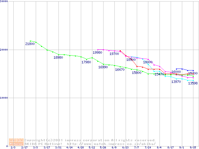 | [↓次グラフ]: | HDD 80GB以上(5,400rpmクラス)の最安値推移 |