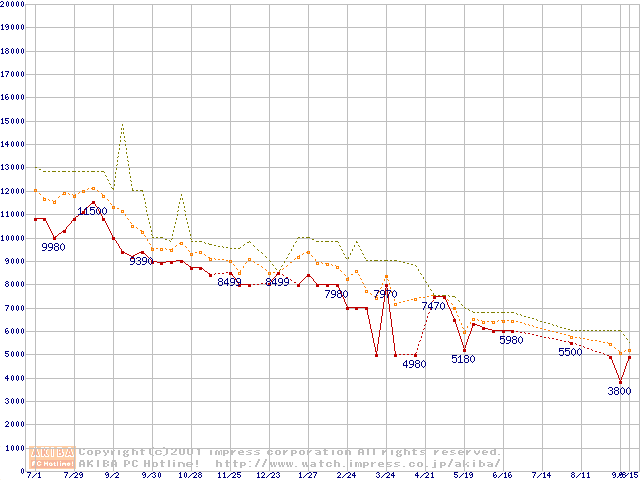 Socket 370 (FC-PGA,FSB 66MHz,L2 128KB)の最安値推移
