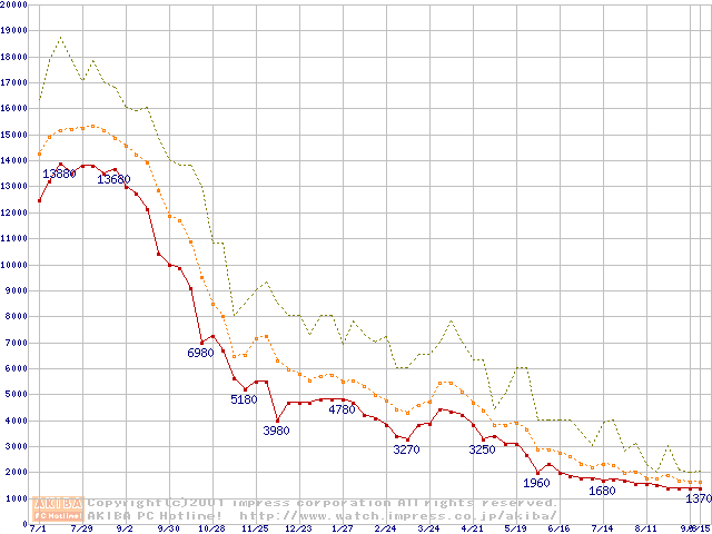 PC100 SDRAM DIMM CasLatency=2の最安値推移