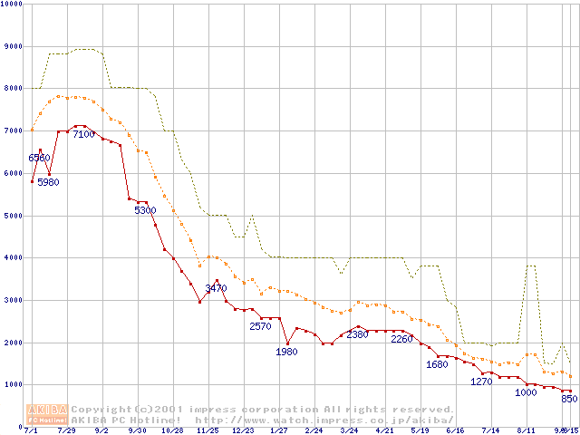 PC100 SDRAM DIMM CasLatency=2の最安値推移