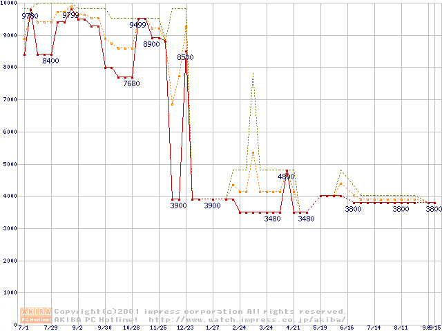 PC100 SDRAM DIMM CasLatency=2 ECC対応の最安値推移