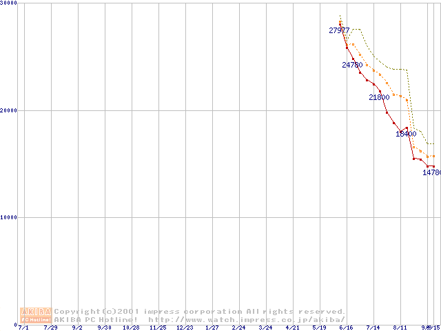 Socket A (Thunderbird,PGA,FSB 200MHz,L2 256KB)の最安値推移