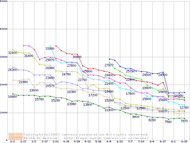 | [↑前グラフ]: | Socket A (Thunderbird,PGA,FSB 266MHz,L2 256KB)の最安値推移 |