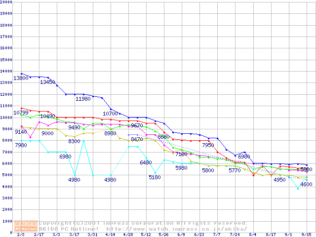 | [↑前グラフ]: | Socket 370 (FC-PGA,FSB 100MHz,L2 128KB)の最安値推移 |