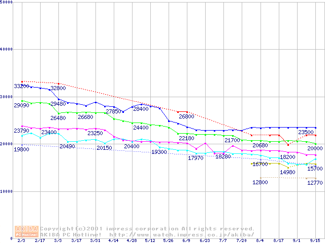 | [↑前グラフ]: | Socket 370 (FC-PGA2,FSB 133MHz,L2 256KB)の最安値推移 |