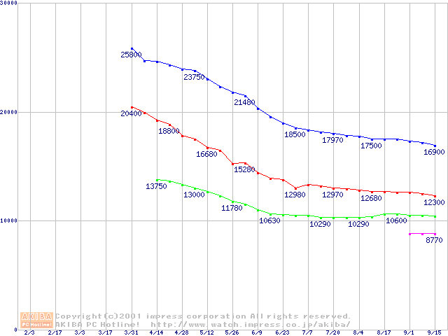 | [↓次グラフ]: | Deskstar 75GXP (7,200rpm Ultra ATA/100 2MB)の最安値推移 |