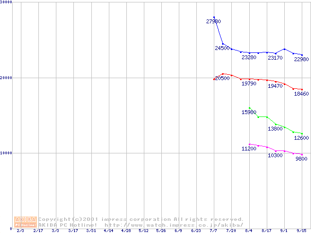 | [↑前グラフ]: | Fireball Plus AS (7,200rpm UltraATA/100 2MB)の最安値推移 |