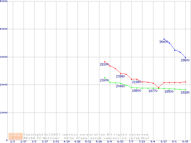 | [↑前グラフ]: | Deskstar 75GXP (7,200rpm Ultra ATA/100 2MB)の最安値推移 |
