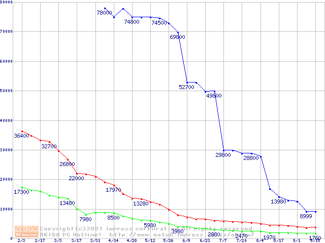 | [↑前グラフ]: | PC100 SDRAM DIMM CasLatency=2 ECC対応 Registeredタイプの最安値推移 |