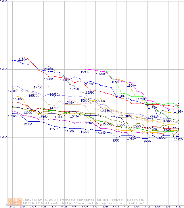 HDD主要製品(最安値1万5千円~2万円未満)の最安値推移