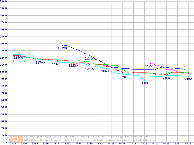 | [↑前グラフ]: | HDD 10GB~20GB未満(7,200rpmクラス)の最安値推移 |