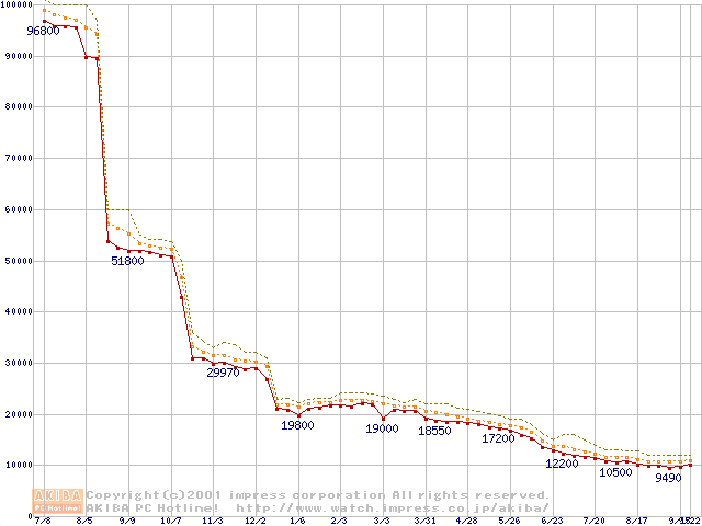 Socket A (Thunderbird,PGA,FSB 200MHz,L2 256KB)の最安値推移