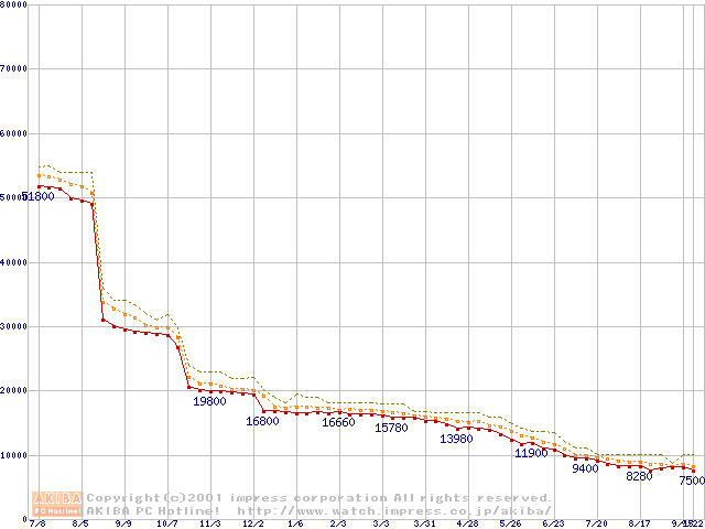 Socket A (Thunderbird,PGA,FSB 200MHz,L2 256KB)の最安値推移
