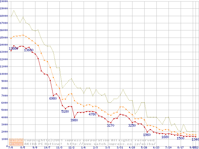 PC100 SDRAM DIMM CasLatency=2の最安値推移