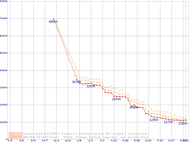 Socket A (Thunderbird,PGA,FSB 200MHz,L2 256KB)の最安値推移