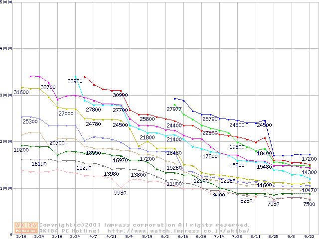 | Socket A (Thunderbird,PGA,FSB 200MHz,L2 256KB)の最安値推移(テスト公開中) |