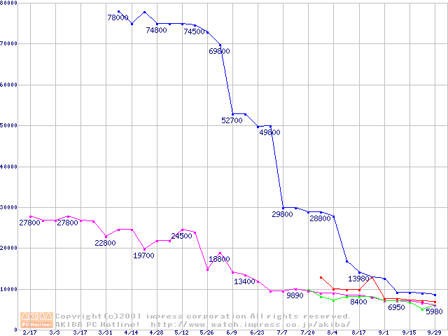 | [↓次グラフ]: | メモリ主要製品(最安値1万円以上)の最安値推移 |