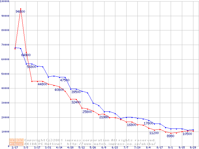 メモリ主要製品(最安値1万円以上)の最安値推移