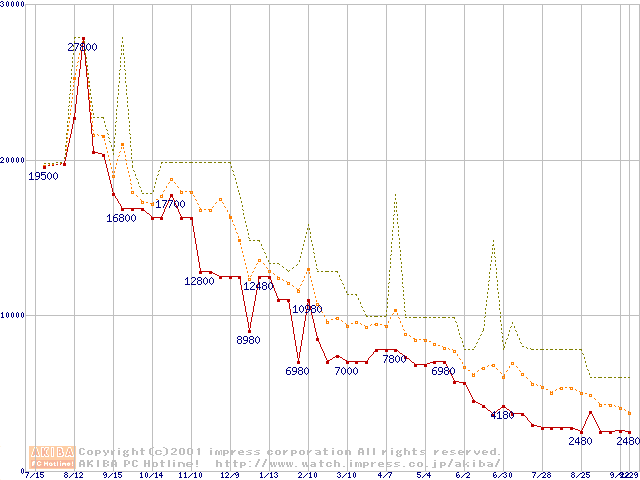 PC133 SDRAM DIMM CasLatency=3 ECC対応の最安値推移