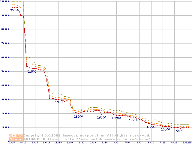 Socket A (Thunderbird,PGA,FSB 200MHz,L2 256KB)の最安値推移