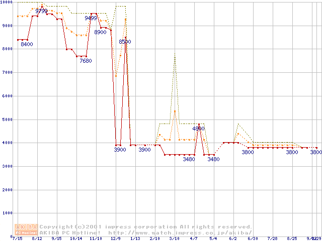 PC100 SDRAM DIMM CasLatency=2 ECC対応の最安値推移