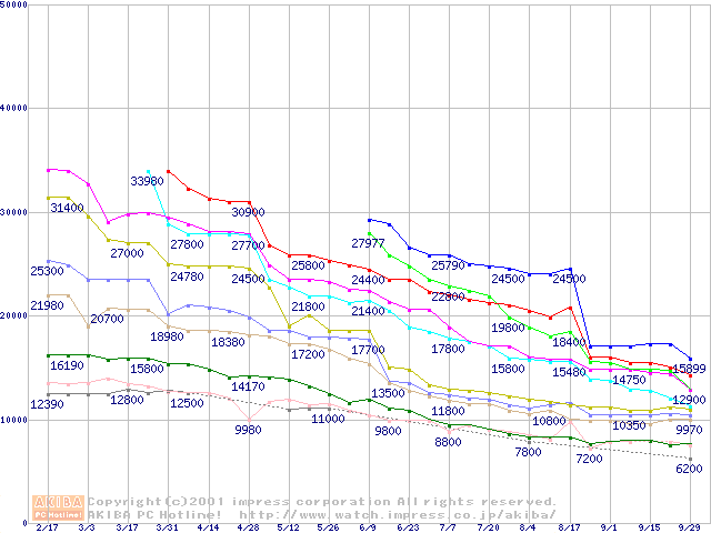 | Socket A (Thunderbird,PGA,FSB 200MHz,L2 256KB)の最安値推移(テスト公開中) |