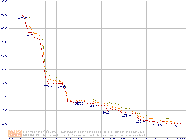 Socket A (Thunderbird,PGA,FSB 200MHz,L2 256KB)の最安値推移
