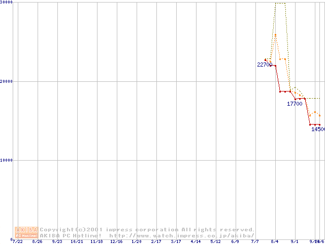 PC100 SDRAM DIMM CasLatency=2 ECC対応 Registeredタイプの最安値推移